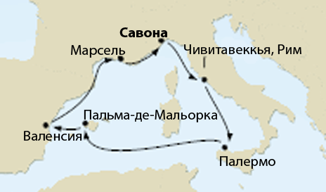 ДеньПортПрибытиеОтправление1Савона / Милан (Италия)посадка17:002Чивитавеккья, Рим (Италия)08:0019:003Ольбия, о. Сардиния (Италия)08:0014:004о. Ибица, Балеарские о-ва (Испания)15:00-5о. Ибица, Балеарские о-ва (Испания)-19:006Пальма-де-Мальорка (Испания)09:0019:007Марсель (Франция)13:0019:008Савона / Милан (Италия)08:00высадкаВ стоимость круиза включено: